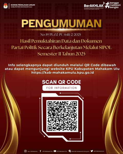 Komisi Pemilihan Umum Kabupaten Mahakam Ulu telah melaksanakan verifikasi terhadap data dan dokumen pemuktahiran Partai Politik secara berkelanjutan melalui SIPOL Semester II Tahun 2025 di tingkat Kabupaten Mahakam Ulu. Berdasarkan hasil verifikasi terdapat 4 Partai Politik yang telah melakukan Pemuktahiran yaitu : Partai Nasdem Partai Gelombang Rakyat Indonesia Partai Demokrat Partai Persatuan Pembangunan Pemutakhiran data dan dokumen Partai Politik ini bertujuan untuk menjaga keakuratan, validitas, dan keterkinian data Partai Politik sebagai peserta Pemilu, serta sebagai bagian dari upaya peningkatan kualitas penyelenggaraan Pemilu dan Pemilihan. Untuk informasi lebih lanjut dapat diunduh melalui link berikut : UNDUH DISINI ....