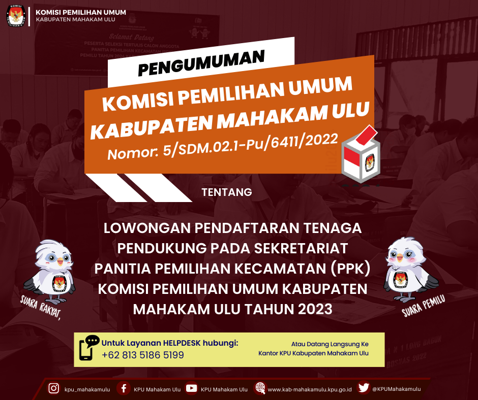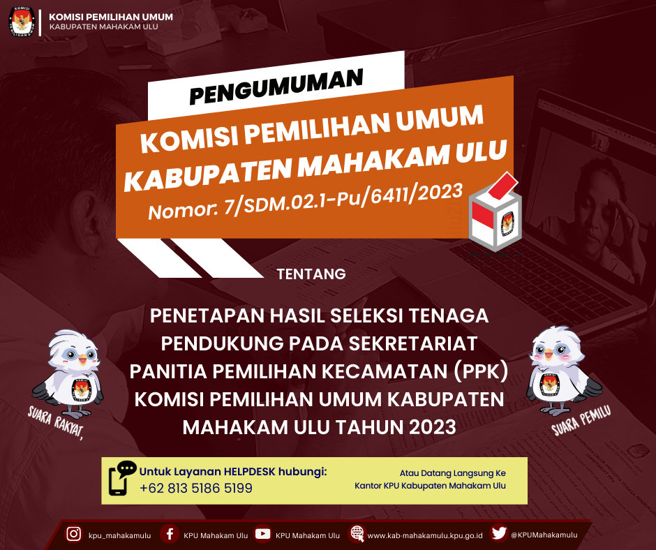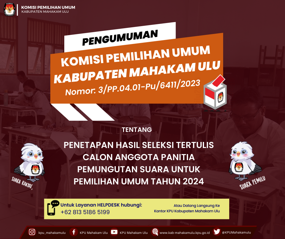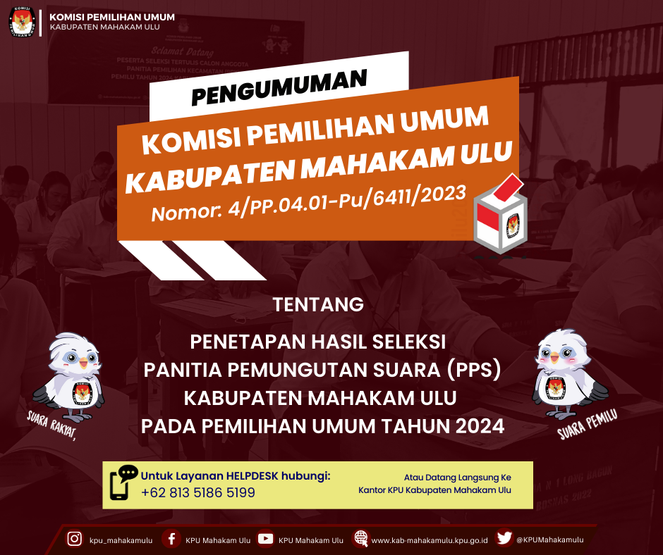 Pengumuman Penetapan Hasil Seleksi PPS Kabupaten Mahakam Ulu Sabtu, 21 Januari 2023 07:00 1967 Pengumuman Penetapan Hasil Seleksi PPS Pemilu Tahun 2024 Baca Selengkapnya