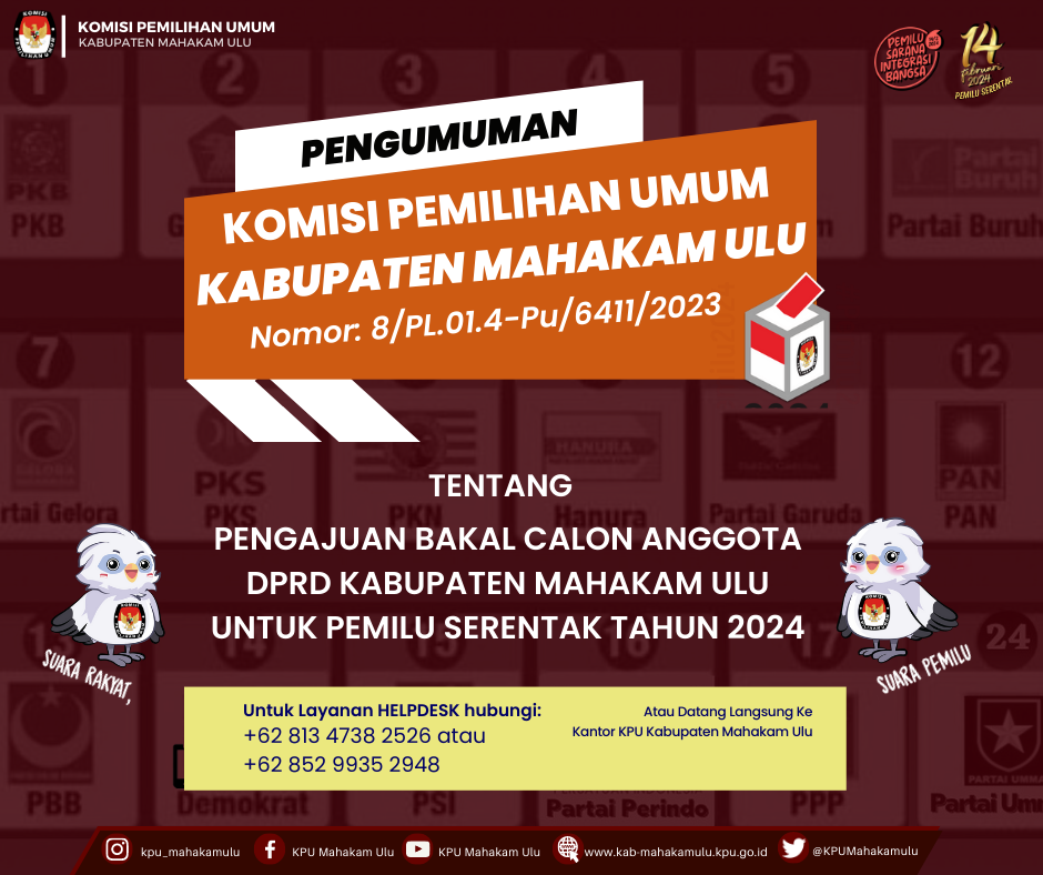 Pengumuman Nomor 8:/PL.01.4-Pu/6411/2023 tentang Pengajuan Bacalon Anggota DPRD Kabupaten Mahakam Ulu untuk Pemilu Serentak 2024 Senin, 24 April 2023 07:00 1943 Dwonload Pengumuman melalui link berikut ini: https://drive.google.com/file/d/1pdlv1mGBOhhjxnv01eZRgWXbQ2WKZ4xn/view?usp=share_link Baca Selengkapnya