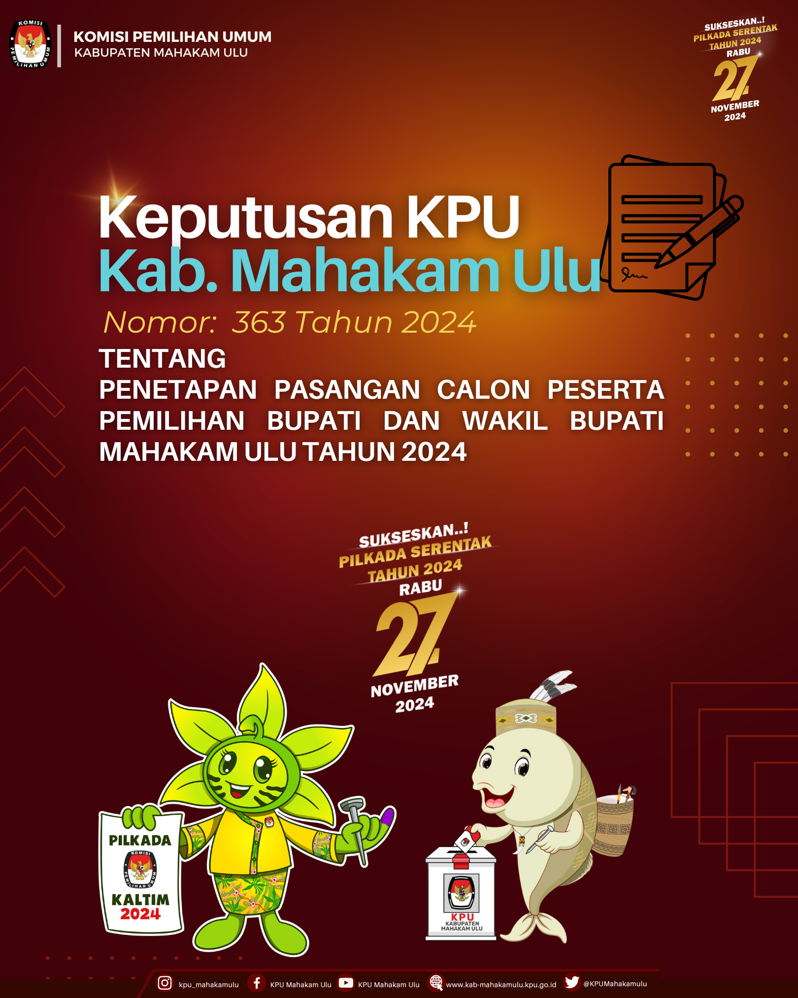 Bahwa untuk melaksanakan ketentuan diatas, Komisi Pemilihan Umum Provinsi Kalimantan Timur mengumumkan daftar Pasangan Calon Gubernur Dan Wakil Gubernur Kalimantan Timur Tahun 2024 sebagai berikut dapat di akses melalui link berikut.