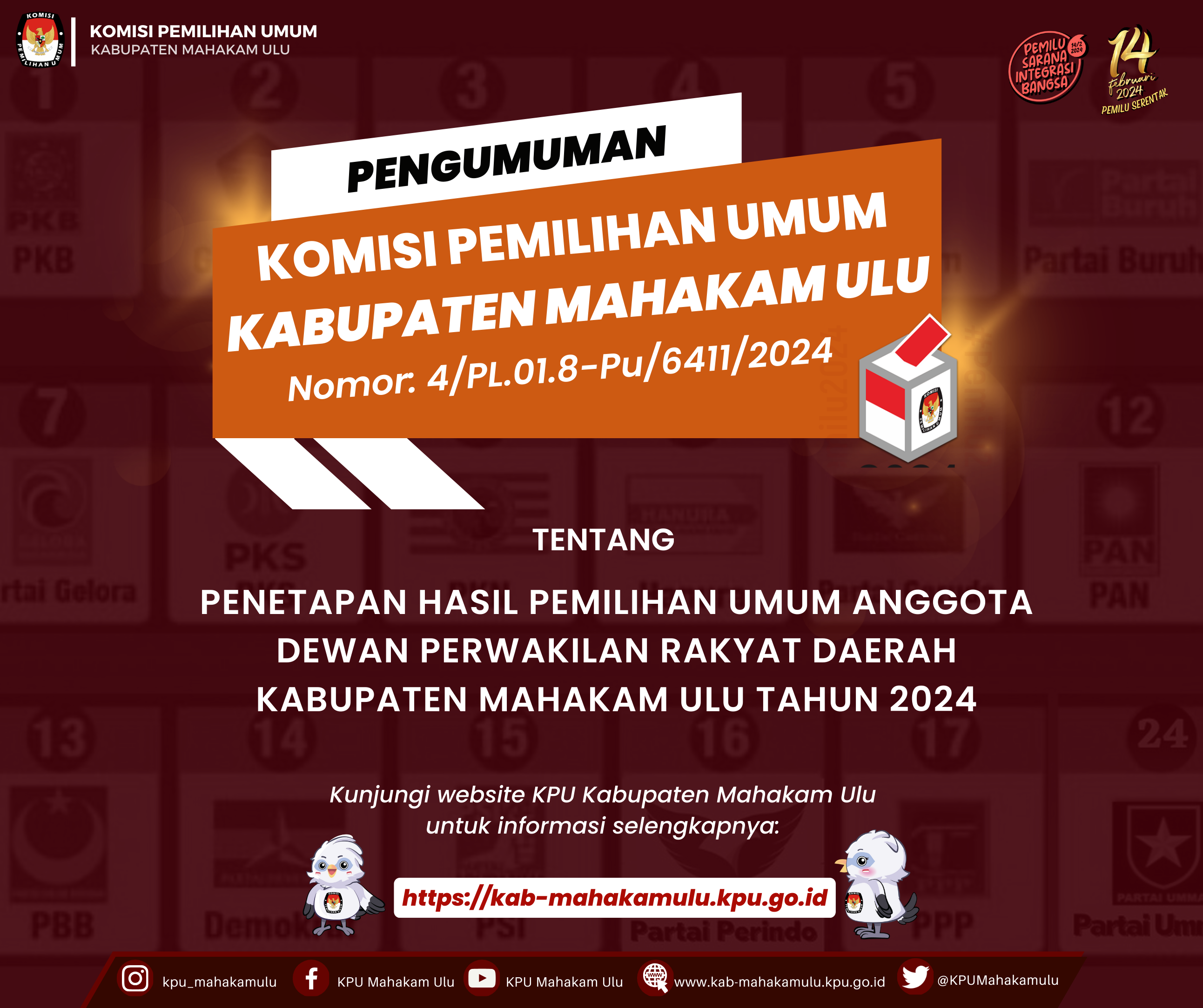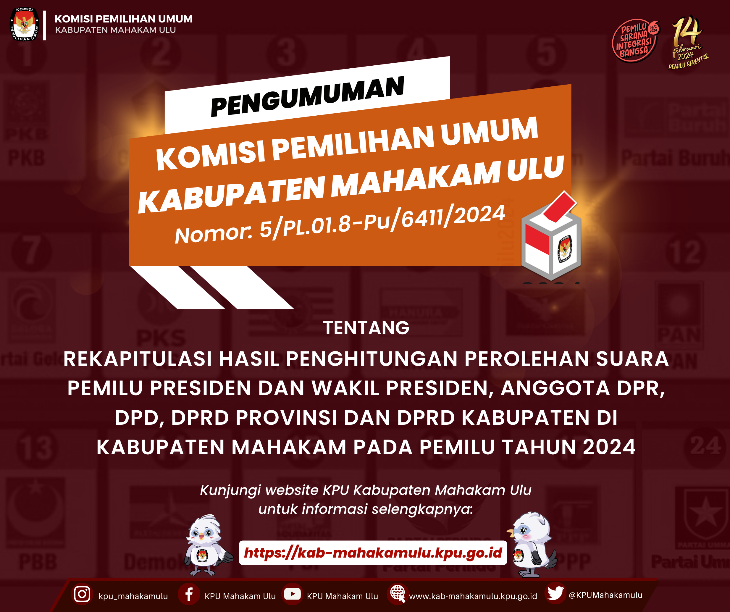 Rekapitulasi Hasil Penghitungan Perolehan Suara Pemilu Presiden dan Wakil Presiden, Anggota DPR, DPD, DPRD Provinsi dan DPRD Kabupaten di Kabupaten Mahakam pada Pemilu Tahun 2024